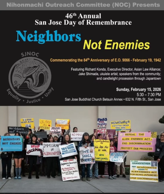 This year, events in both San Francisco Japantown and San Jose Japantown uphold the theme: "Neighbors Not Enemies" and highlight the parallels between detention during World War II and currently. Their programming will include candlelight ceremonies; performances by local artists; featured speakers (San Jose); a roundtable discussion (San Francisco); and more.