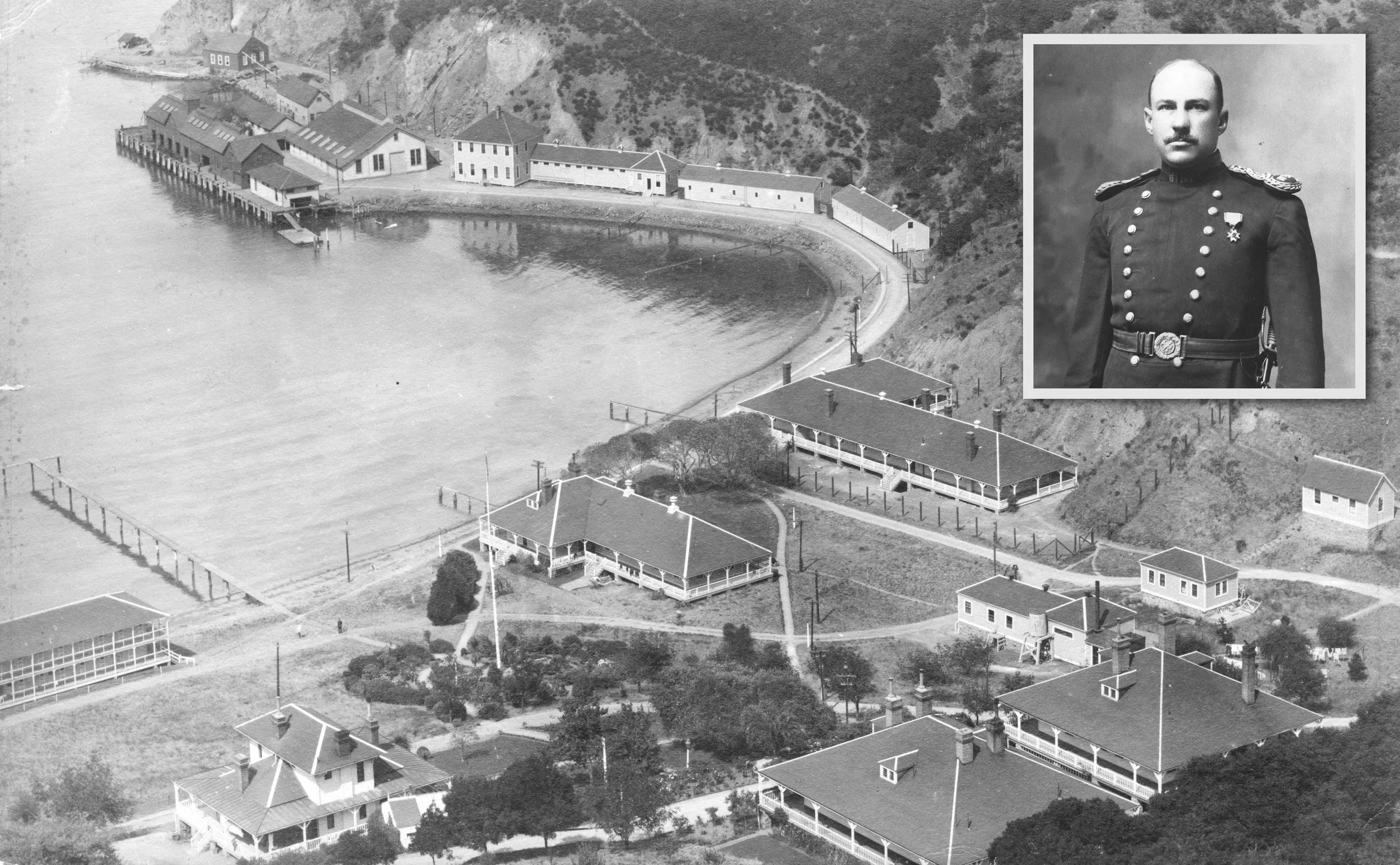 This aerial view shows the quarantine buildings on Angel Island as they appeared in 1911. Today, passenger ferries arrive at Ayala Cove, which was once the site of the US Quarantine Station—then known as Hospital Cove. The inset image features Dr. Frederick Trotter, who is referenced in the article. He served on Angel Island until 1912, when he was reassigned to a post in Honolulu. Photo credits: National Library of Medicine.