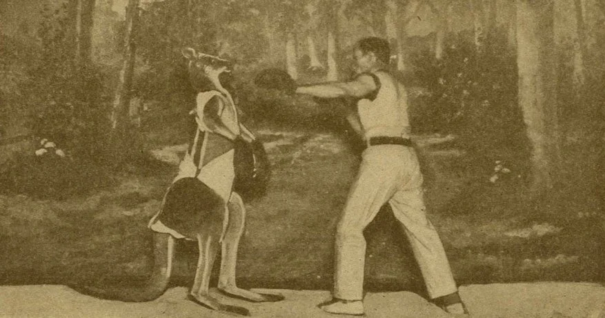Bob Fitzsimmons Jr., mentioned in the article, was a red kangaroo named after the famed professional boxer Bob “The Fighting Blacksmith” Fitzsimmons. Known simply as “Bob Jr.,” the kangaroo performed regularly on the vaudeville circuit until his retirement from boxing in 1916. Following his career, he lived out his remaining years at Milwaukee’s Washington Park Zoo. The image above, taken at Coney Island in 1915, shows Bob Fitzsimmons alongside his namesake kangaroo, “Fitz.”